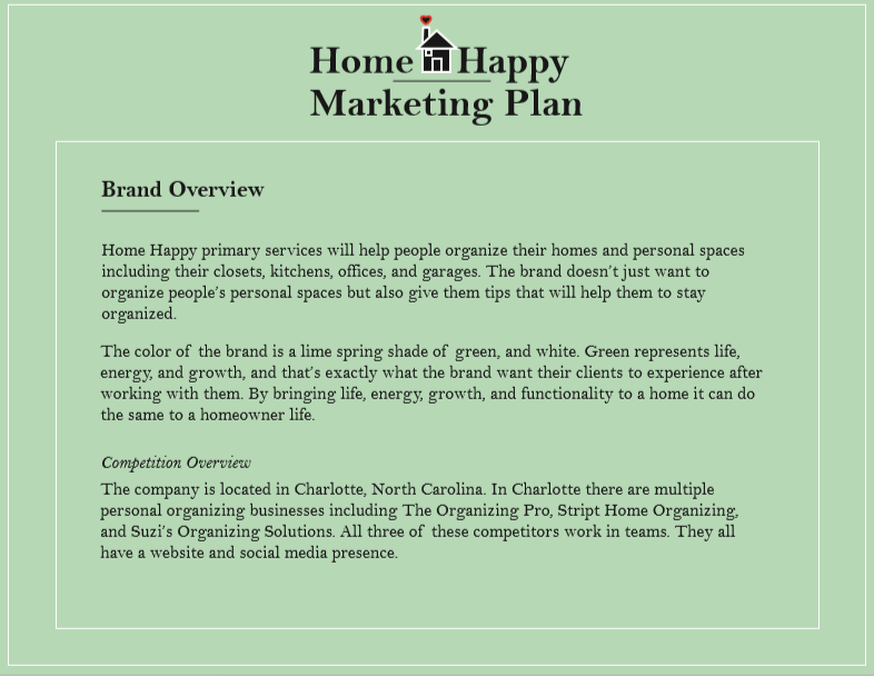 I created a digital marketing strategy for a upcoming organizing business called Home Happy.